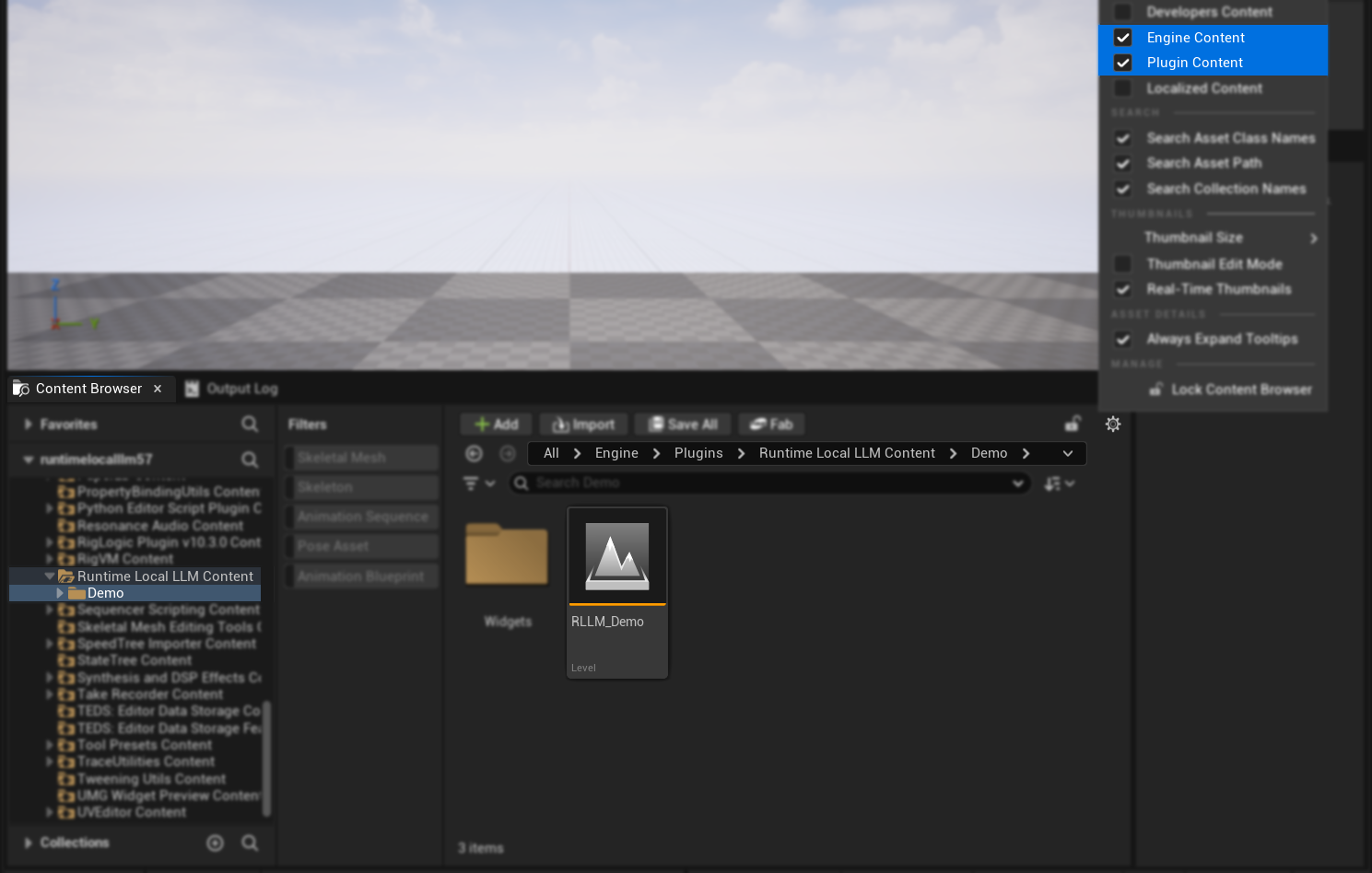 If you can't see the plugin directory, open the Content Browser, click on the Settings button in the top-right corner, and enable Show Engine Content and Show Plugin Content. The demo project should be located in the EnginePluginsRuntime Local LLM Content directory.